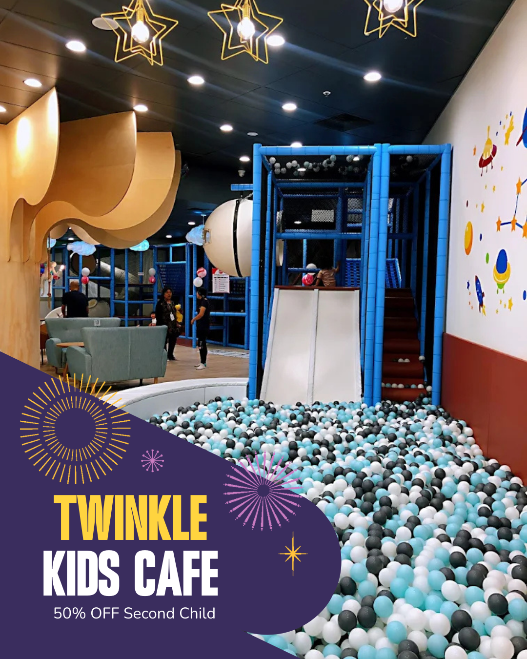 More playtime at Twinkle Kids Cafe, with a second hour free — giving kids more fun and parents time to unwind.