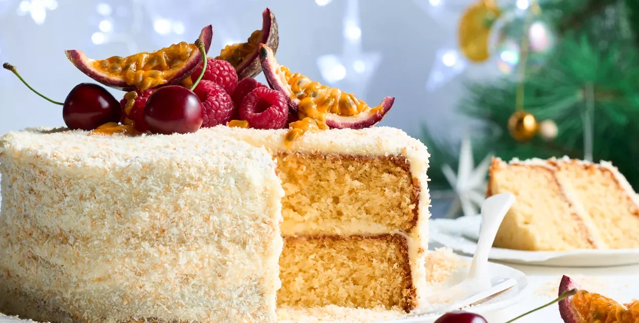 Infused with the vibrant flavours of the tropics, this delightful toasted coconut and passionfruit layer cake is perfect for your Christmas dessert table.